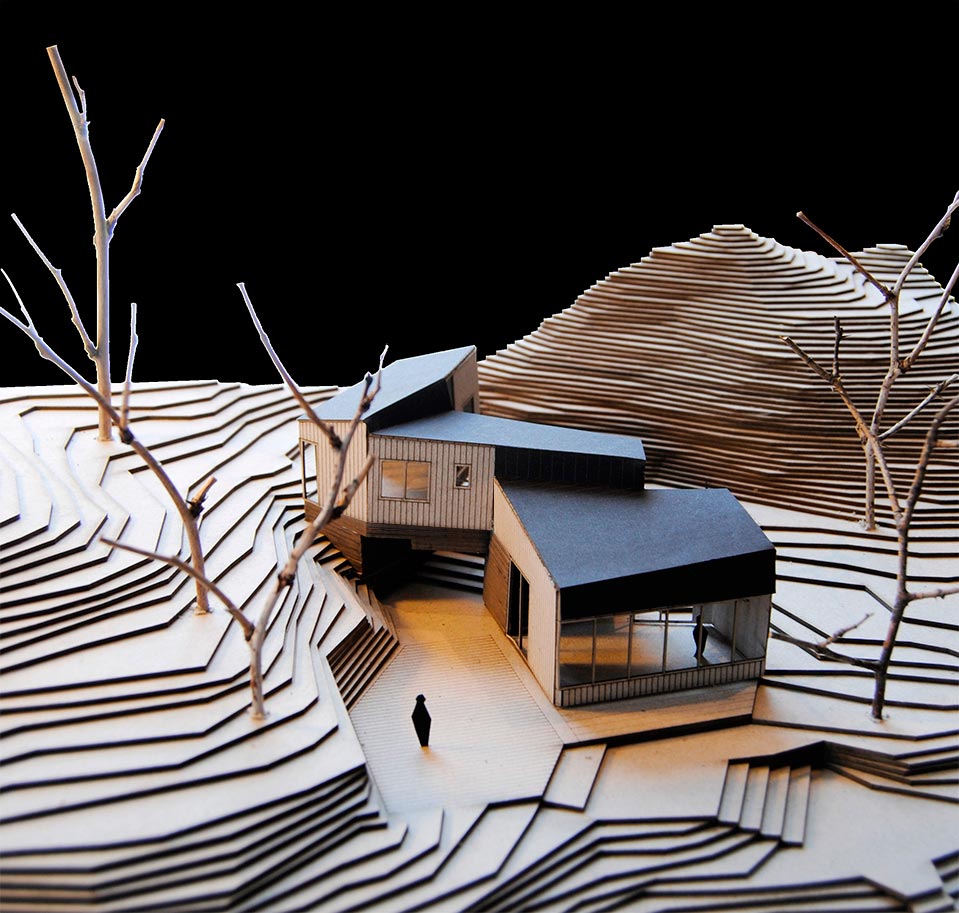 The site for this house is a beautiful and steep spot on the southern coast of Bamble. The house zigzags adapting its shape to the topography, embracing outside terraces and offering changing perspectives towards the fjord.
