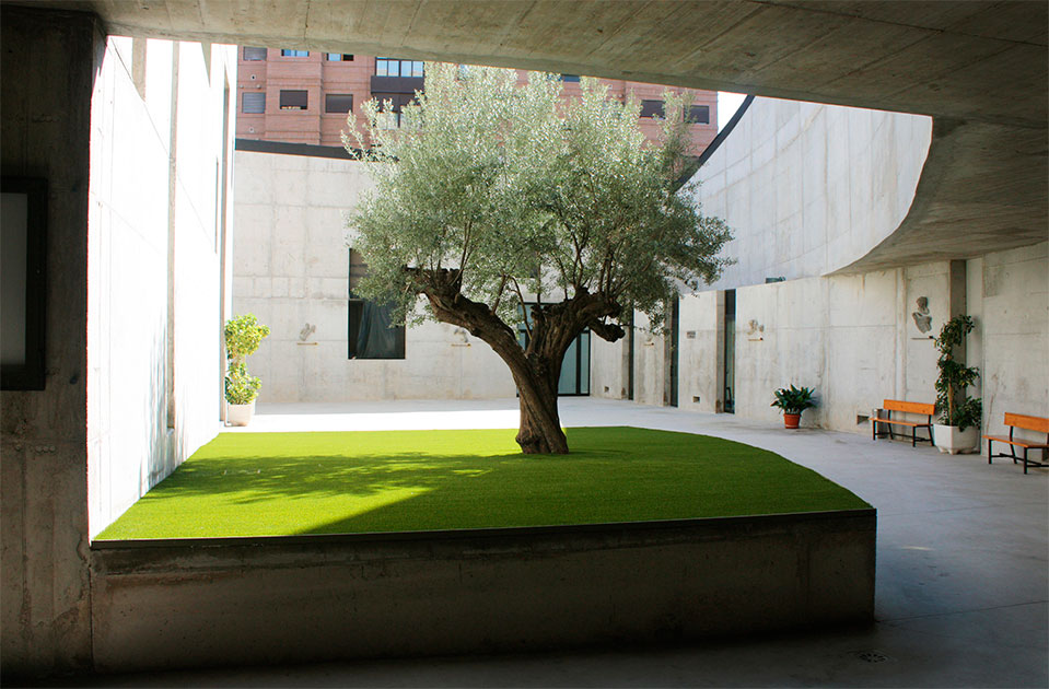 A narrow gap between two convexe walls define the inviting relationship with the outside world. Inside, convexity turns into concavity around an olive tree, we discover a cloister where two dansing walls guide us along a promenade towards silence and light…